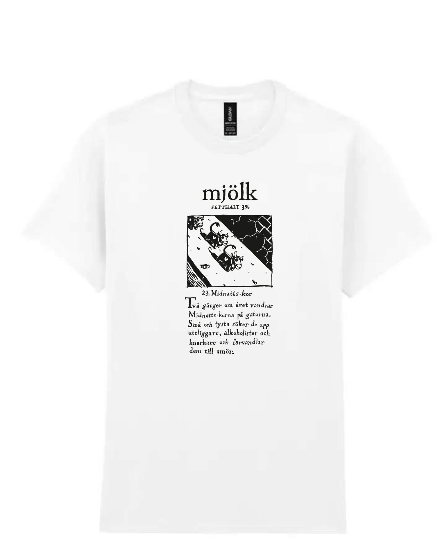 Max Andersson's legendary milk cartons with Arla-haren" and "Midnattskorna" are available in sizes S-XL. They are available in white in sizes S-XL.